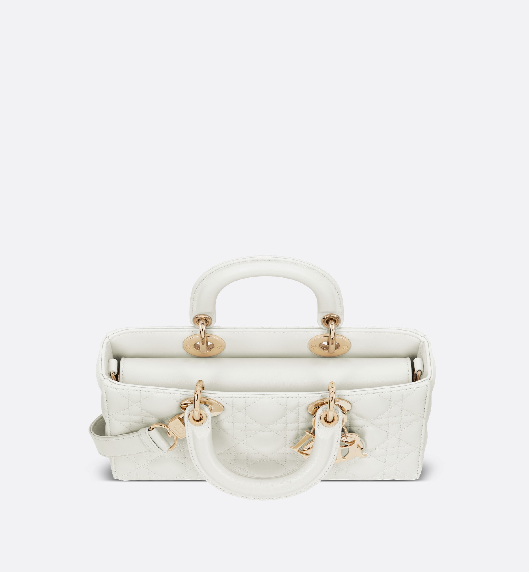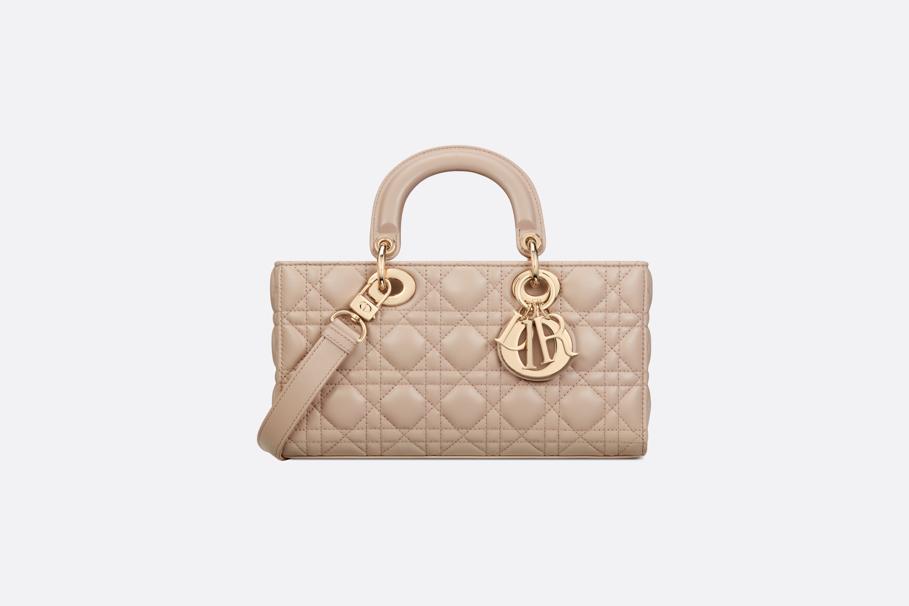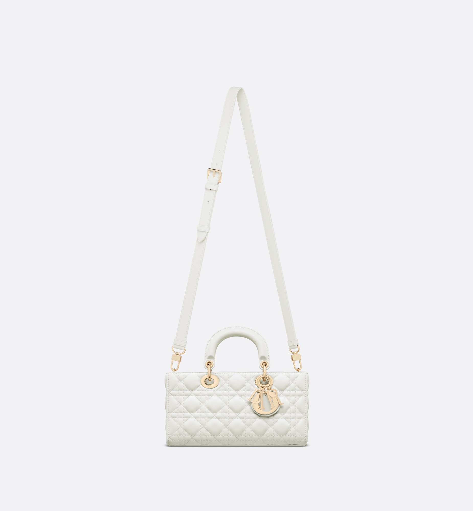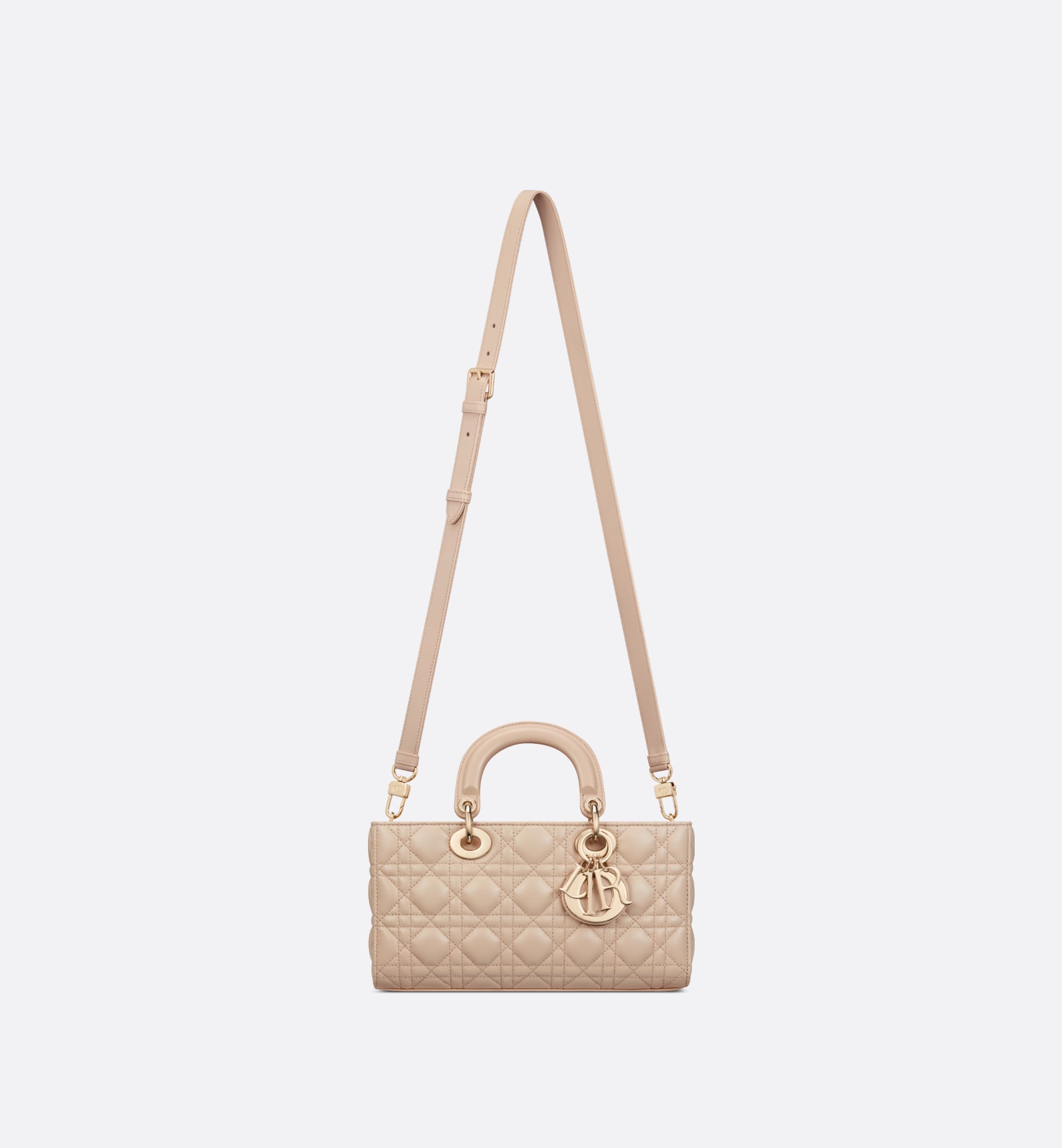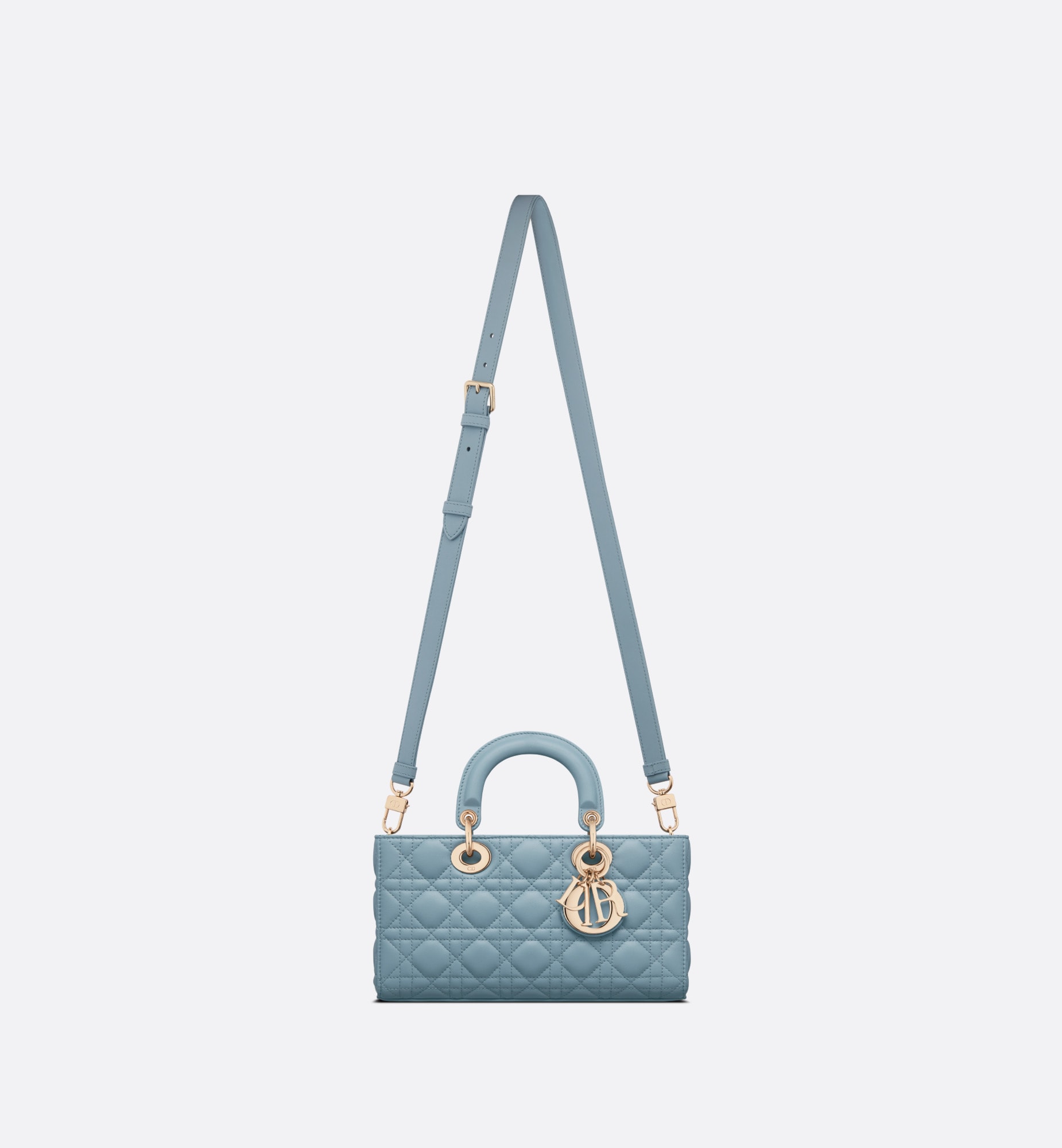 メゾンのビジョンであるエレガンスと美を体現した「レディ D-ジョイ」バッグ。「レディ ディオール」ラインらしい、すっきりとしたデザインが魅力です。ホライゾンブルーのラムスキンに「カナージュ」ステッチを施した、洗練されたタイムレスなスタイルに仕上げました。ペールゴールドトーンのメタル製D.I.O.R.チャームがシルエットを上品に引き立てます。取り外しが可能なチェーン ショルダーストラップと、長さの調節と取り外しが可能なレザー ショルダーストラップが1本ずつ付属。ハンドバッグとしてはもちろん、ショルダーバッグやクロスボディバッグとしてもお楽しみいただけ、普段使いに最適なミディアムサイズのモデルです。